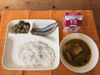 焼きししゃも、さといもの和風カレー汁、ささみとこまつなのいためもの、ごはん、牛乳