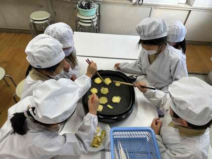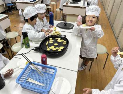 菜箸が長くて使いにくかったですが、子どもたちは協力して焼いていました。