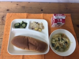 中華おこわ、卵スープ、きゅうりのピリ辛あえ、黒糖パン、牛乳