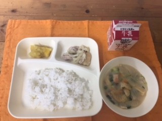 鶏肉の塩こうじ焼き、かす汁、くりきんとん、ごはん、牛乳