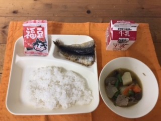 いわしのしょうがじょうゆかけ、含め煮、いり大豆、ごはん、牛乳