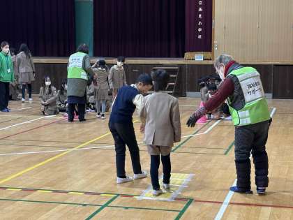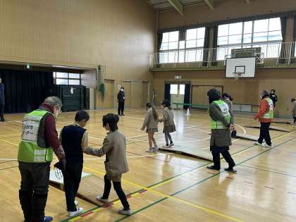 アイマスクをして歩くことで、恐怖感を体験した子どもたち。一緒に歩くとき、どんな風にしたら安心できるのか、気づくことができました。道の少しの変化も声掛けをすることが大事だということも学びました。