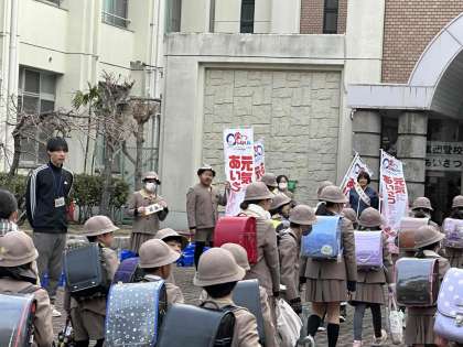 児童会の子どもたちが正門で「おはようございます。」と、大きな声で呼びかけをしていました。