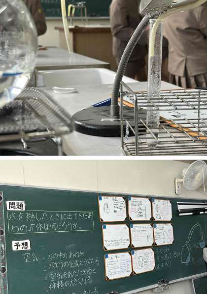 実験の結果、どちらの意見も出ましたが、考察した結果、泡の正体は水ということがわかりました。全員納得です。