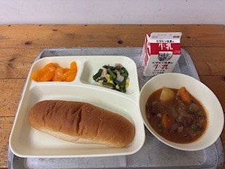 ビーフシチューは、給食では、上新粉(米粉)でとろみをつけました。お家などでは、小麦粉と油で作ったルウを使うことが多く、小麦粉にアレルギーのある場合は食べることができませんが、給食のビーフシチューは、小麦や牛乳にアレルギーがあっても食べることができます。油を使っていないので、あっさりしたビーフシチューになりました。(栄養教諭)