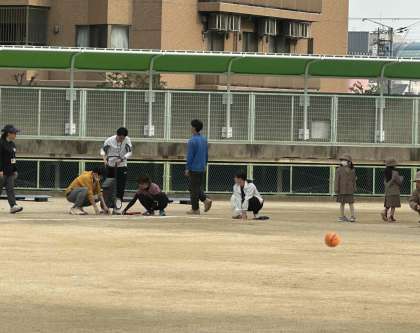 測定のために、体育部の先生方が運動場に50メートルのコースを作っていました。