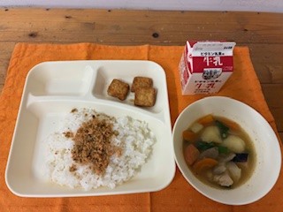 鶏肉とじゃがいもの煮もの、あつあげのしょうゆだれかけ、紅ざけそぼろ、ごはん、牛乳