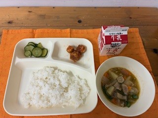 まぐろのオーロラ煮、豚肉と野菜の煮もの、きゅうりの甘酢づけ、ごはん、牛乳
