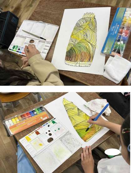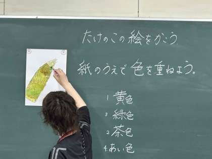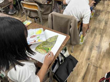 水彩の特徴を生かし、水をたっぷリ使って、画用紙の上で色を重ねていくことに取り組んでいました。