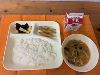 きびなごてんぷら、みそ汁、わかたけ煮、ごはん、牛乳