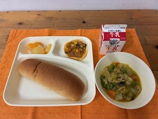 豚肉と野菜のカレースーをプ煮、変わりピザ、ミックスフルーツ(缶)、黒糖パン、牛乳