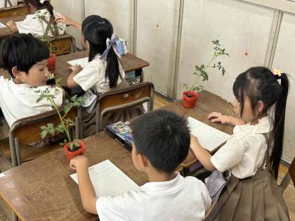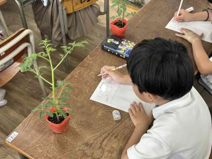 2年生では1人1鉢,ミニトマトを育てます。