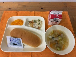 マカロニグラタン、ウインナーとキャベツのスープ、みかん(缶)、コッペパン(ブルーベリージャム)、牛乳