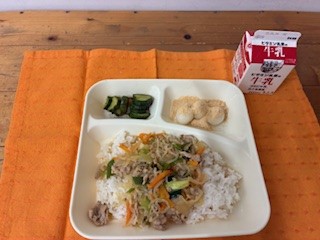 豚丼、きゅうりのかつお梅風味、白玉だんご、牛乳