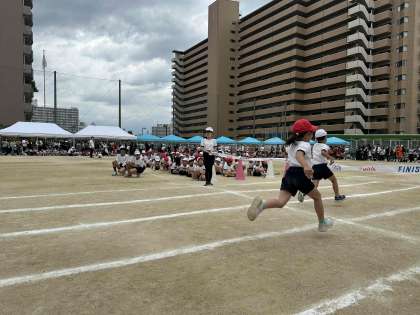 かけっこは、1年生の時は直線を走っていましたが、今年はコーナーを走りました。
