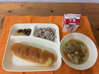 豚肉のバジル風味焼き、鶏肉とキャベツのスープ、うずら豆のグラッセ、おさつパン、牛乳