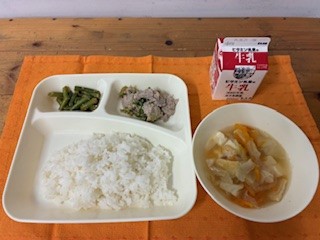 豚肉の梅風味焼き、五目汁、さんどまめのごまあえ、ごはん、牛乳