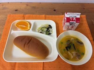鶏肉とかぼちゃのシチュー、ミックス海そうのサラダ、オレンジ、パンプキンパン、牛乳