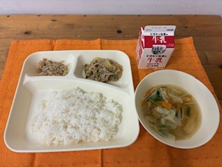 豚肉のごまみそ焼き、五目汁、ツナともやしのいためもの、ごはん、