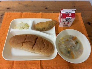 サーモンフライ、豆乳スープ、キャベツのゆずドレッシング、黒糖パン、牛乳