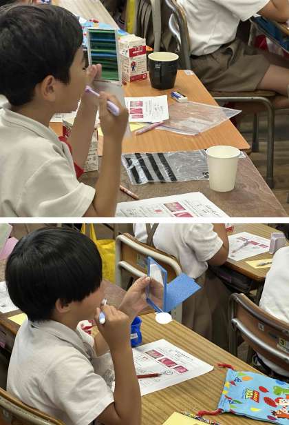 虫歯の原因などを学習した後は、正しい歯みがきの仕方を練習しました。