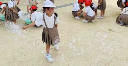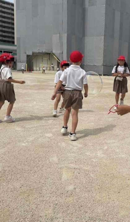 ハンガーやうちわなどを使って、大きなシャボン玉、連続でできるシャボン玉などを作り、子どもたちは大喜びでした。