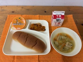 かぼちゃのミートグラタン、スープ、みかんゼリー、黒糖パン、牛乳