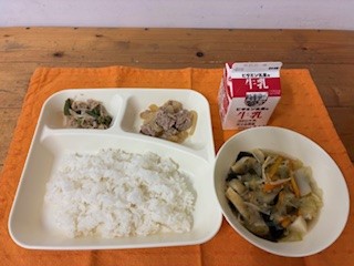 豚肉のしょうが焼き、五目汁、ツナと野菜のいためもの、ごはん、牛乳