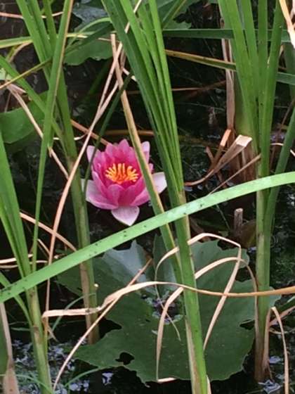 中庭のビオトープには、赤と白の蓮(ハス)の花が開花しました。