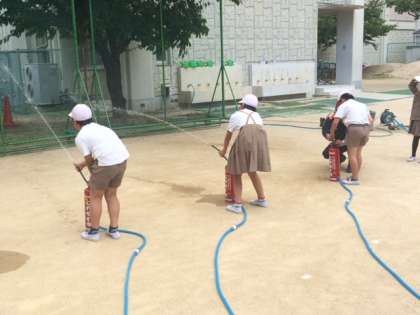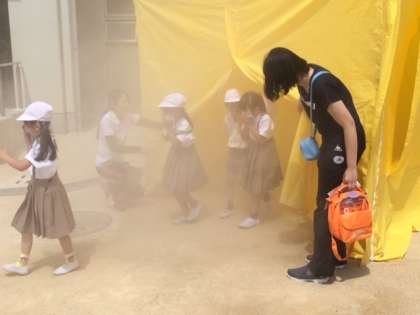 6月2日(木)は、火災の避難訓練がありました。全校で運動場に避難した後は、1年生は煙中体験。2・4・6年は消火器の体験(水消火器)を行いました。