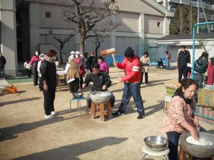 1月12日(日)11時より、地域の子ども会が中心となって餅つき大会が行われました。火を起こして蒸す、石臼と杵を使ってつく、それを丸める、きな粉餅やおぜんざい、しょうゆ焼きもちにする、PTA・ソフトボールチーム・白寿会・地域の皆さんの協力のもと楽しいひと時を過ごすことができました。皆さん本当にありがとうございました。