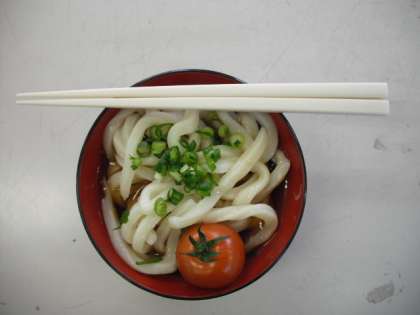 完成した年明けうどんです。紅白になるようにトマトが入っています。