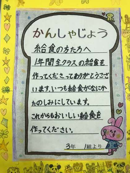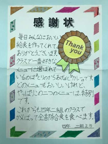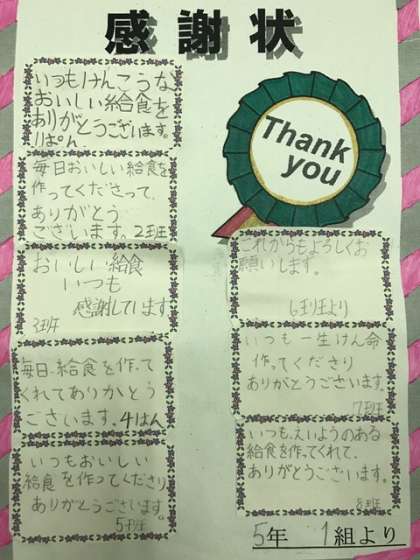 給食週間には、給食調理員さんとの交流給食も行いましたが、各クラスで普段からおいしい給食を毎日作っているいただいてる感謝の気持ちを感謝状という形で表しました。少しだけ紹介します。