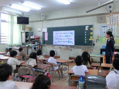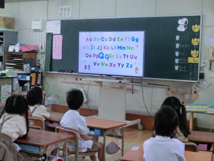 朝の15分間、英語を楽しく学びます。放送室から映像を流して教室で60インチのテレビを見てアルファベットを読みました。