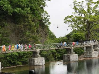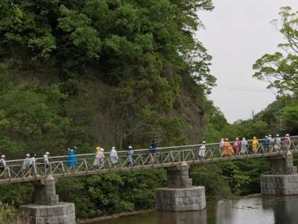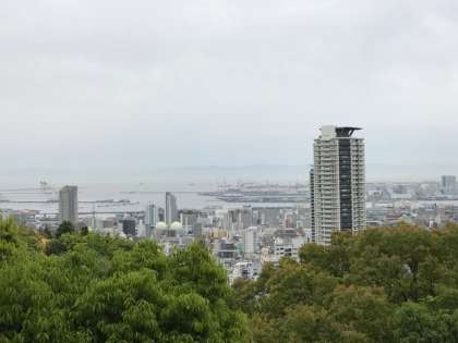 下山途中のダムに架かる橋の上を歩いているところをパチリ!こちらに気付いて手を振ってくれる子もいました。「見晴らし展望台」に着くころには雨もあがり、ポートアイランドや遠くに淡路島も見えました。雨が心配でしたが大雨にも合わずに無事学校に帰ってきました。