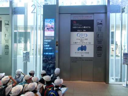 クラス単位でエレベーターに乗り、最上階へ