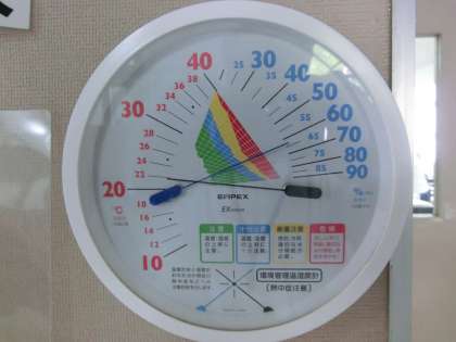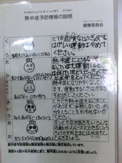 熱中症の様子を知らせるために、職員室と校長室の間に、掲示物を設置しています。