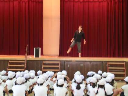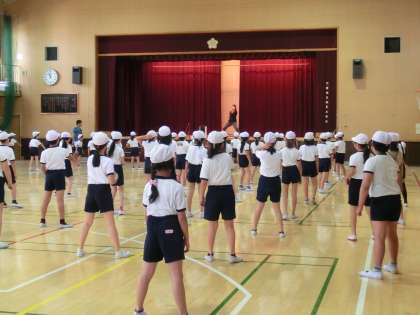 写真は、4年生で、講堂で、団体演技の練習の様子です。