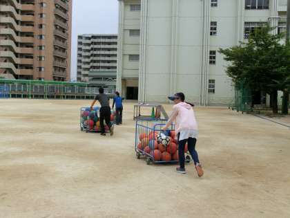 そして、運動会に使用する物を運動場の倉庫に移動しました。いよいよ運動会の競技の練習も始まります。