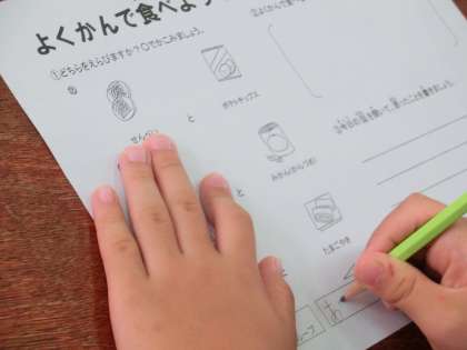 よくかむとよいことがあることがわかり、ワークシートにかいていました。