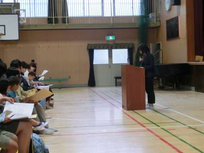 あいさつの中で、事務職員さんから入学準備金について説明をしました。