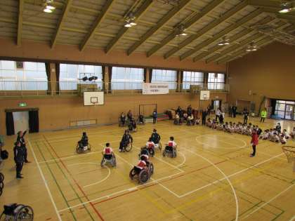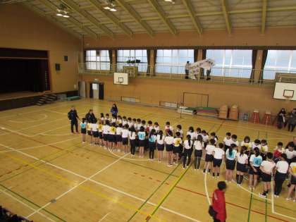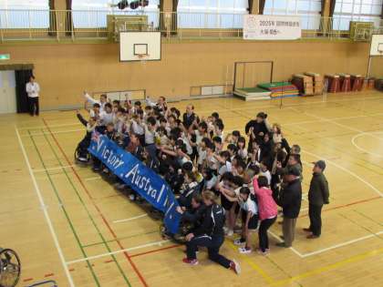 オーストラリアチームの選手とゲームもしました。その後、参加者全員で記念写真を撮影しました。選手が帰るときには、6年生が1列になってハイタッチをして見送りました。