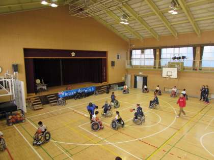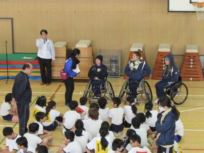去る2月14日、国際親善女子車椅子バスケットボール大阪大会の開催に合わせ、試合に参加するオーストラリアチームの選手の方が来校され、地域親善交流会を本校で行いました。地域、保護者、PTA、本校6年生が参加しました。