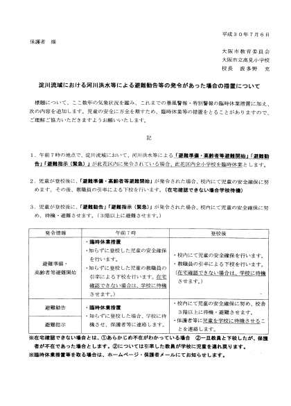 昨日、市教委から避難勧告等の発令があった場合の措置について