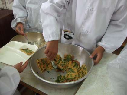 韓国・朝鮮料理を知らせる「チヂミ」が登場しました。生地に「にら」と「にんじん」の野菜を入れて、ごま油の風味をきかせています。タレがなくても食べやすいように、「コチジャン」や粉末の「かつおぶし」で、生地に味をつけてから焼き上げています。できたて「チヂミ」のお味は、いかがですか?