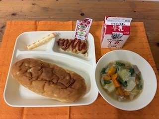 とうふローフ、洋風煮、棒チーズ、おさつパン、牛乳