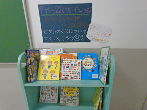 その前に、世界の国々に興味を持ち、調べていこうということで、教室の前に世界の国々について書いている本を置いています。