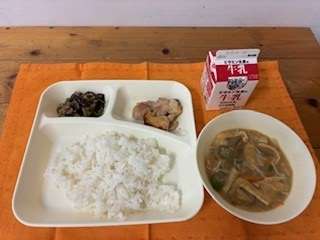 鶏肉のてり焼き、とうがんのみそ汁、なすのそぼろいため、ごはん、牛乳