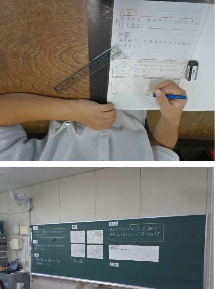 前時までの三角形や四角形の内角の和を使って、五角形の内角の和は何度になるか考えました。