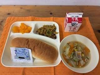 カレーマカロニグラタン、豚肉と野菜のスープ、みかん(缶)、コッペパン(ブルーベリージャム)、牛乳